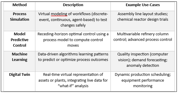 Chemical & Process Industries: Pinch analysis and steady-state simulation have long optimized refinery and petrochemical plants’ heat integration (e.g. pinch targets in crackers and reformers). Model Predictive Control is now standard in chemical plants (distillation, polymerization) to maintain optimal product yield. Plant digital twins (sometimes called “smart plant” models) are emerging to monitor equipment health and process bottlenecks in real time.