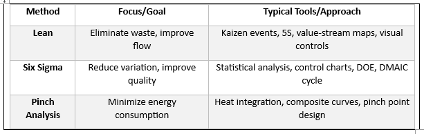 Pinch Analysis: Benefits – Systematic identification of energy-saving opportunities; can significantly cut utility costs; Challenges – Specialized to thermal networks; requires detailed thermodynamic data and expertise.